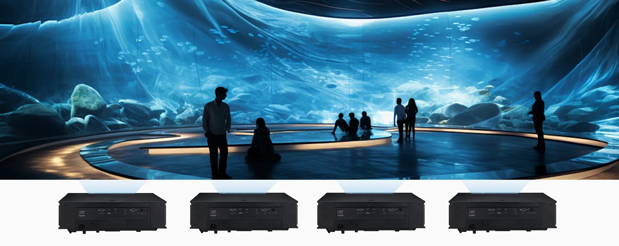 Le projecteur à grande échelle KOONEW E5 offre des capacités intégrées de fusion des bords, permettant une fusion transparente entre plusieurs projecteurs sans matériel supplémentaire, libérant ainsi une créativité illimitée dans vos installations.