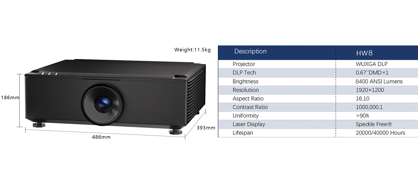 Technologie de projection : WUXGA DLP ENTRÉE HDMI ×2 Rapport de projection de l'objectif :